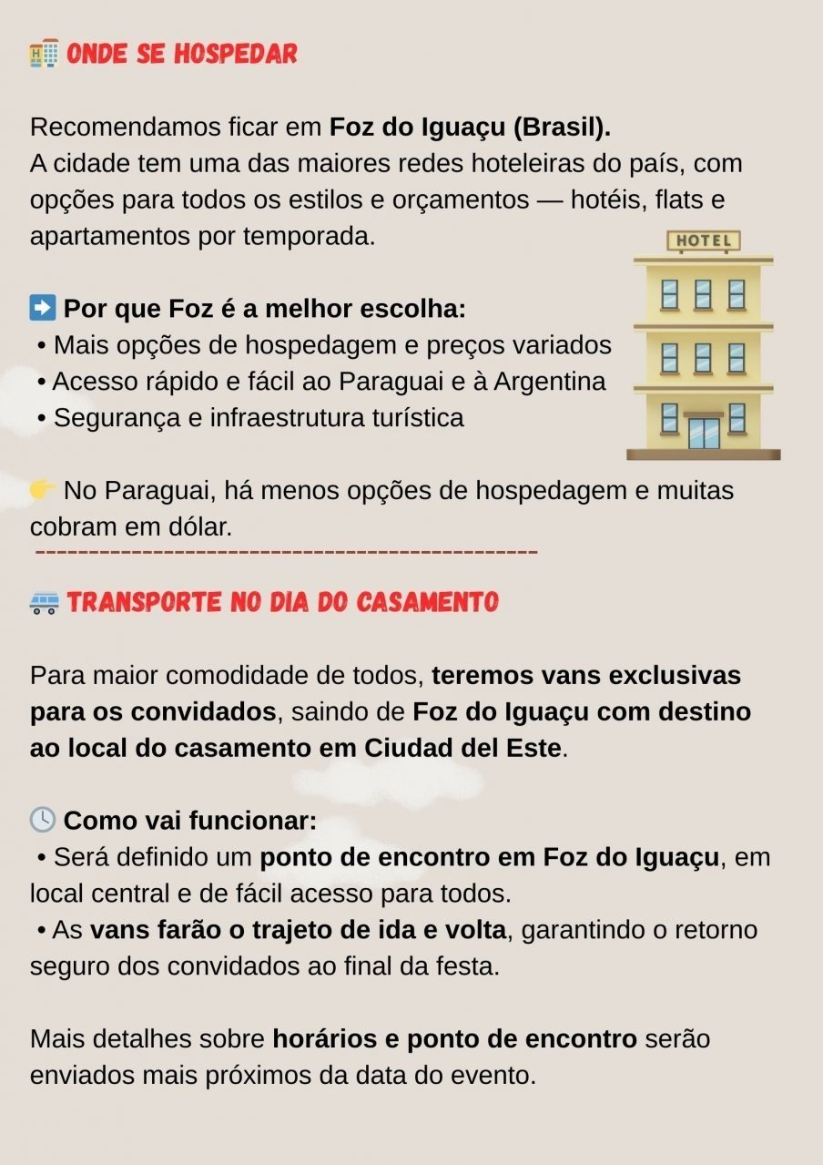 Aqui vocês encontrarão informações importantes sobre a cerimônia, recepção, hospedagem, traje, localização e tudo o que preparamos para que possam aproveitar esse momento com tranquilidade.